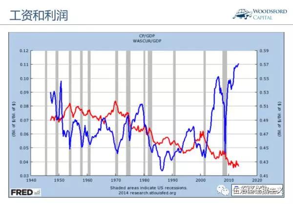 上图来自于美联储的数据显示,美国工人工资在GDP中的比重,从2000年以来就逐年下降,目前已是历史新低。而同期的公司利润在GDP中的比重(上图蓝线),则不断上升。广大中等收入人群的主要收入都来自于工资,而资本家的收入则主要来自于公司利润(股票)。因此这种剪刀差造成的贫富差距进一步扩大就不难让人理解了。