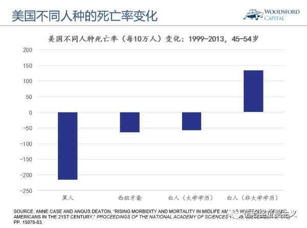 而最“受伤”的那部分人群,就是美国的低学历白人。如上图所示,在过去15年中,美国其他人种的死亡率都有不同幅度的下降,但是低学历的白人的死亡率,却不降反升。这和一开始本文提到的美国总统特朗普的支持者人群不谋而合,显示了其背后深刻的经济原因。