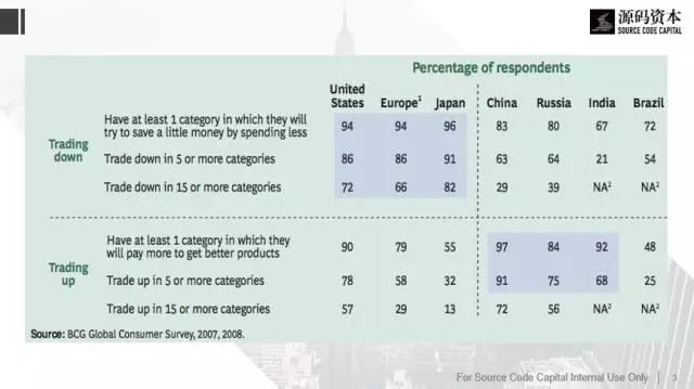 这种“此消彼长“的消费行更多体现在各品类的消费支出占比,而非绝对的消费支出金额。波士顿咨询在十年前做过全球七个国家的消费者调研,发现这种此消彼长的消费行为是全球性的。即使在经济下行国家,多数消费者会少花点钱、省点钱(以下简称降级),仍然有部分消费者会在某些品类上多花钱买更好产品(以下简称升级)。