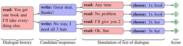 类似的想法已被用于游戏环境规划中,但从未被应用于语言上,因为语言可能的动作数量要高得多。为了提高效率,研究人员首先产生了一组较小的候选语言来表达,然后对于每个候选语言,他们反复模拟对话的完整未来,以估计它们的成功程度。该模型的预测精度足够高,使得该技术在以下几个方面大大提高了谈判策略: