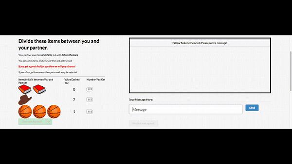 每个机器人都提供自己的价值函数,它表示对每个类型的项目关心多少(比如对于机器人1,每个球值得3分)。 在生活中,两个机器人都不知道其他机器人的价值函数,必须从对话中推断出(如果你说你想要球,那你应该很重视球)。