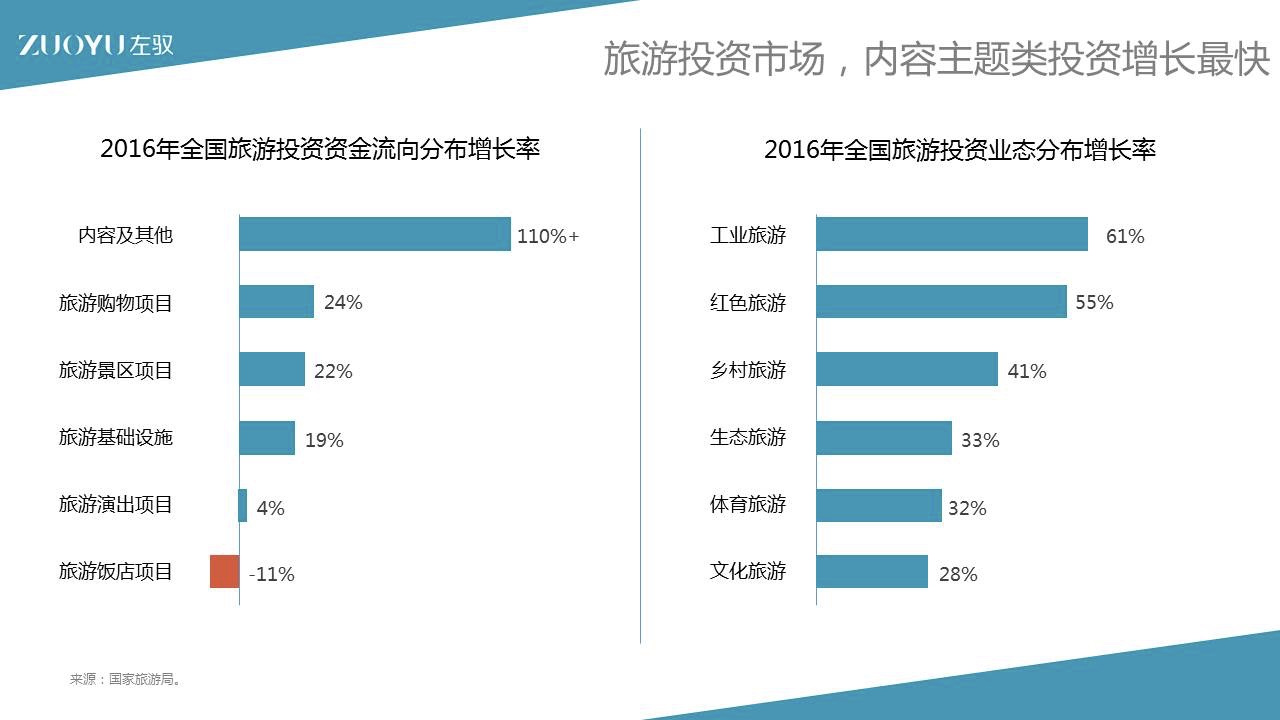 根据国家旅游局发布的数据,从 2016 年全国旅游投资资金增长率来看,传统基建公司、旅游饭店、旅游演出整个增长趋势逐渐变缓,增长最快的是内容和其他。这个观点和吴老师,蚂蜂窝陈总高度是一致的,我们认为整个旅游投资其实已经由资源驱动进入客源驱动时代。在资源时代的时候,其核心是供给,讲究供给,可能在那个时代供给相对缺乏,但是到客源时代我们一切都要以市场为核心。现在是内容经济,应更多注重体验,资源时代注重开发,现在是注重运营。