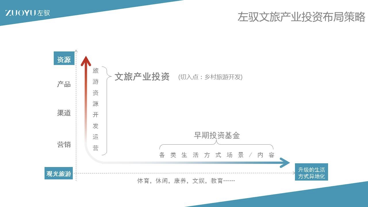最后,我还是将左驭目前的发展状况给各位分享一下:整个左驭现有的业务体系有三大块业务,文旅产业投资、财务顾问业务和早期投资业务。