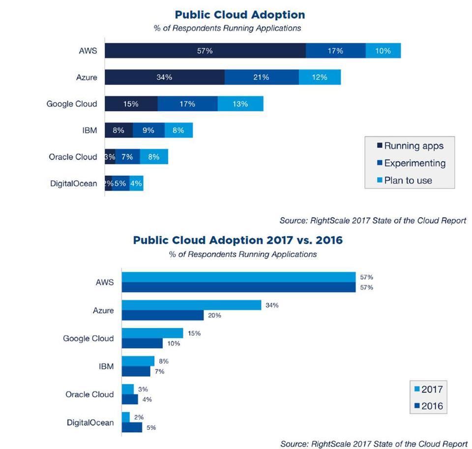 RightScale 2017年调查显示,微软Azure云的采用(Microsoft Azure adoption)从26% 激增至43%,综合Azure云采用(Overall Azure adoption)从20%上升至34%,目前Azure已达AWS 60%的市场渗透率。微软财报也印证Azure云业务增长之迅猛,2017第2财季Azure营收涨幅高达93%,翻了近一番。