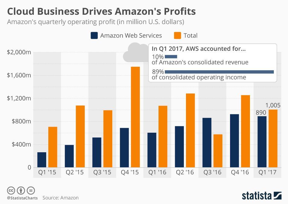 而亚马逊云服务(AWS)就是其中最大、也最受关注的业务。尽管这部分去年仅占约9%年营收,但对却是亚马逊主要利润来源。最新一季度财报显示,云计算贡献约89%利润。