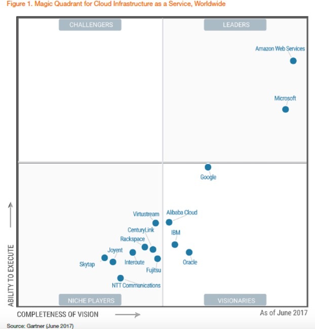 在IaaS领域,Gartner刚发布的全球云服务市场魔力象限显示,AWS仍处于绝对领先,Microsoft Azure是行业老二,谷歌正成为一个不容忽视的挑战者。