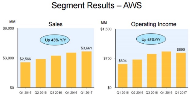 一季度,尽管AWS实现大幅增长,营收为37亿美元,高于去年同期的26亿美元,涨幅高达43%。 但增速却有所放缓,毕竟去年亚马逊的云服务比前年可增长64%。