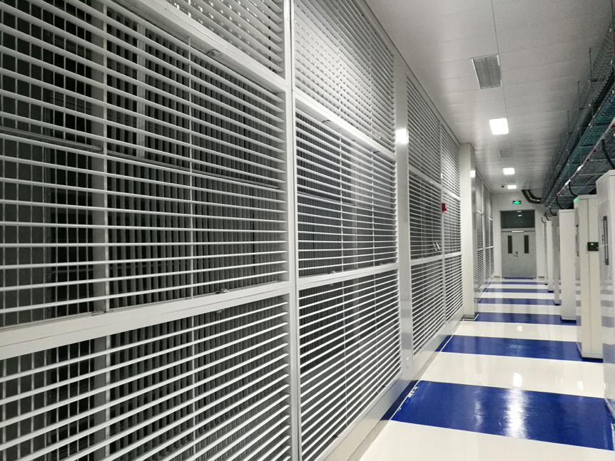 另外一个是高温服务器机房,采用AHU(Air Handle Unit)风墙冷却技术,配合高温耐腐蚀服务器。下面那堵,就是风墙,后墙背后是给机房送冷风的AHU空调。百度相关负责人表示,其实冷源可以是室外新风,也可以是冷冻水,目前大部分数据中心用的都是自然冷源。