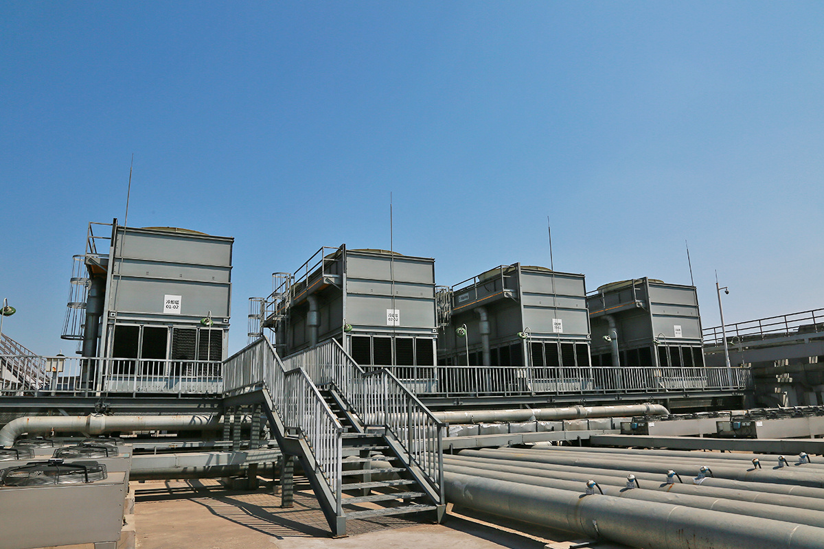 那么问题又来了,谁给冷却水降温呢?答案是室外的空气。加热后的冷却水通过水泵提升到外面的冷却塔,跟空气作热量交换。
