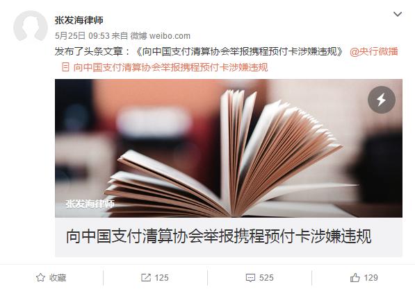 5月25日,张发海律师在微博上实名举报携程预付卡涉嫌“无证经营”支付业务。
