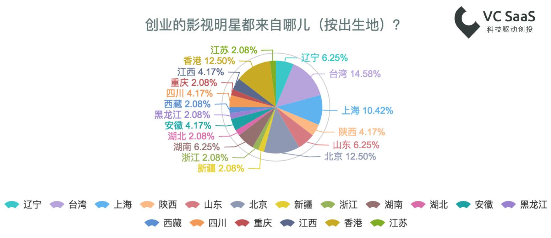 根据以上数据我们可以看到在我国的创业影视明星当中,来自台湾和香港明星独领风骚。他们除了在演艺事业进军内地以外,还尝试在其他领域进军内地和大中华市场,他们分别占据了这部分人的14.58%和12.5%。紧随其后的是来自北京和上海的明星们,分别占据了这部分人的12.5%和10.42%。