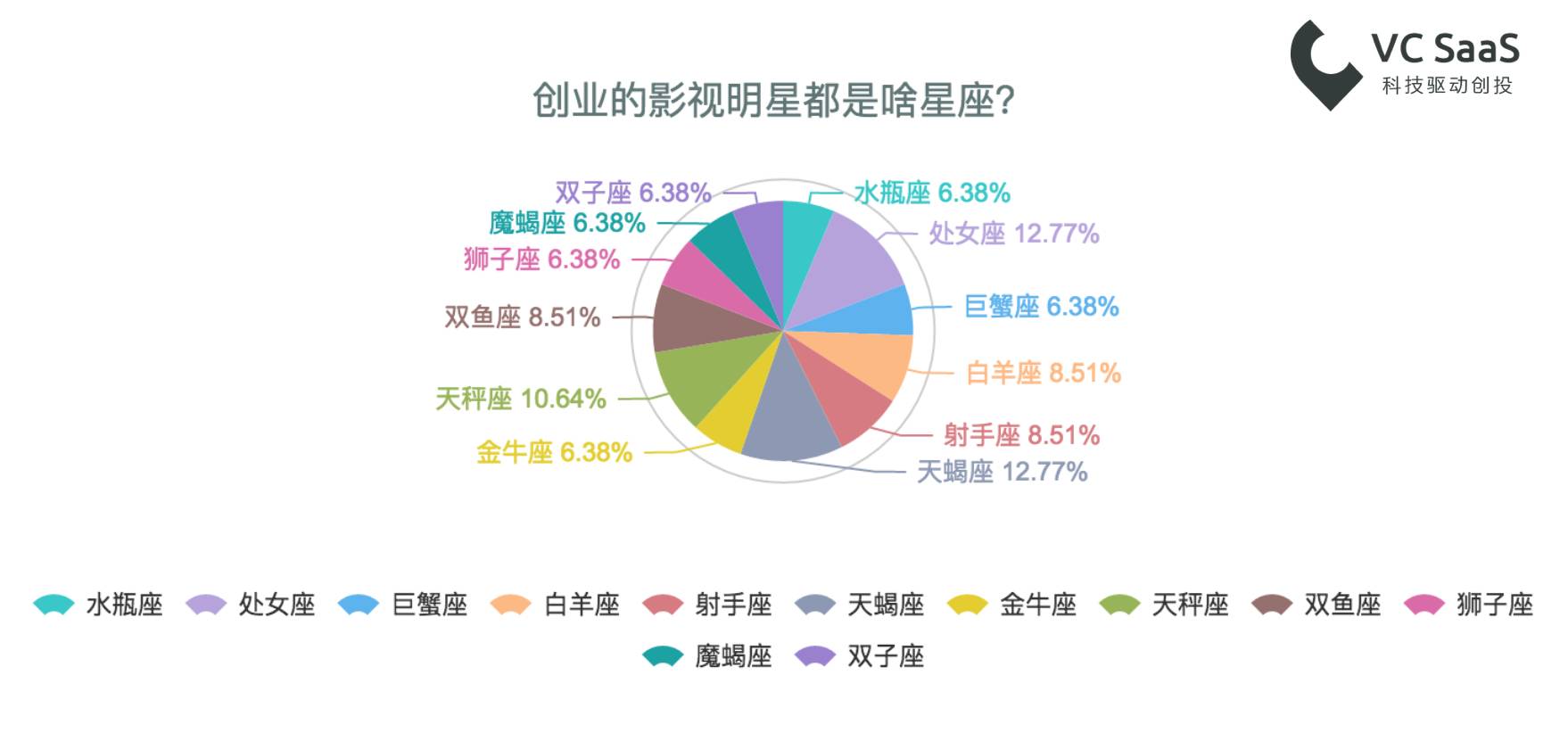 果然是处女座拯救地球,天蝎座谋略十足啊~处女座们的强迫症属性都被影视明星们带到了创业圈。有12.77%的创业影视明星都是处女座和天蝎座的!或许是处女座的性格中这种眼里容不得沙的性格会在创业途中更添一份保障吧。除此之外天蝎座也是商业好手,性格使然,他们在创业路上被坑的几率或许会大大降低。