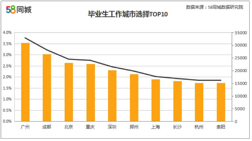 过去,因为高收入、机会多,北上广深等一线城市一直是毕业生的就业首选,如今,58同城的报告显示,这一现象正在改变。根据58同城毕业季数据,2017年毕业生简历投递量前十的城市依次为广州、成都、北京、重庆、深圳、郑州、上海、长沙、杭州、贵阳。