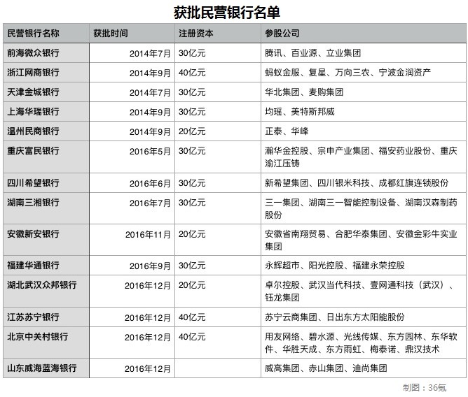 36氪曾经指出,2016年是民营银行数量爆发的一年,从下半年开始几乎以每月一家的速度在增加,自2014年首批五家(微众、网商等)获批后,2015年一整年都没有新的获批记录,直到去年节奏明显加快。银监会称,现在20天就能走完从申请到批准的流程。
