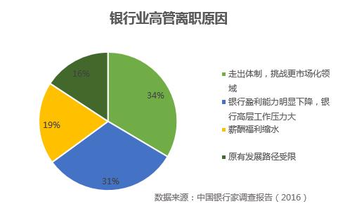 在对1794位银行家进行调研后,中国银行业协会联合普华永道在今年2月发布的《中国银行家调查报告(2016)》调查显示,希望“走出体制、挑战市场化领域”和“银行盈利能力明显下降,银行高层工作压力大”是银行家辞职的两大原因。
