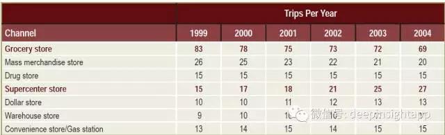 我们再来看一个数据统计,1999到2004年之间,美国人去传统超市的数量从一年83次下降到了69次。相对应的是,他们去超市中心店的数量从一年15次增加到了27次。另外在增加的是去0.99美元这种廉价店次数和去便利店购买的次数在增加。但是美国和亚洲不同,其实去便利店数量还是很少,因为大部分人开车,而且家里附近也有一些Grocery Store。所以7-11这种在美国其实并不成功。