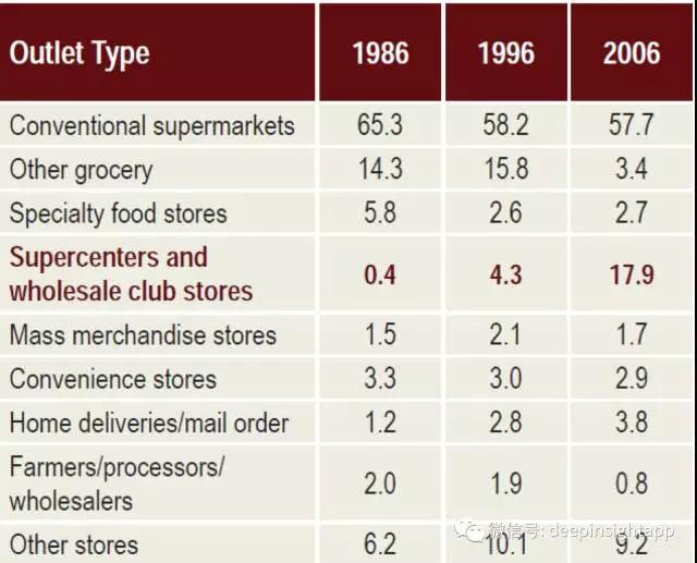这里我们再看一个大的行业变化:1986到2006的20年时间,美国人生鲜购物最大的变化就是超级大超市,批发式的会员俱乐部占比大幅提高。其中两个最有代表的公司就是沃尔玛和Costco。他们的占比从1986年的0.4%提高到了2006年的17.9%,如果再看最近十年这个比例还是继续提高。相比而言,传统的普通超市(Conventional Supermarkets)占比出现下滑,而提供特殊类食品的供应商比例也下滑。一个很大的原因是汽车普及之后,越来越多美国人喜欢去一次性购物的大超市。当然,他们因为采购量足够大,也能给用户足够便宜的价格。