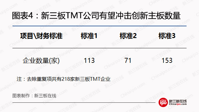 根据港交所对创新主板上市公司的要求,财务标准主要参考的是港交所主板公司。因此,新三板在线研究中心在1780家TMT企业中,按照港交所主板财务标准测试的结果,目前约有218家TMT企业可以冲刺“创新主板”。