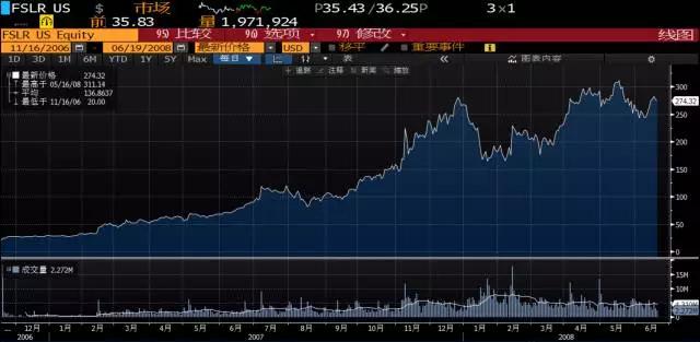 在光伏刚刚出来的时候,资本市场对光伏企业是极度的狂热。在2005-2007年,两年的时间里,那时候光伏组件的龙头,First Solar的涨幅超过13倍,市值约为200亿美金,而2007年,First Solar的销售额仅为5亿美金,盈利为1.6亿美金,对应PS为40倍,PE为125倍。