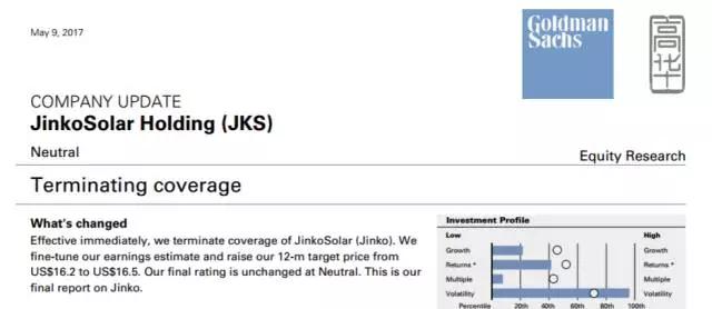 比如,高盛在2017年5月就终止覆盖目前全世界最大的光伏组件厂商,晶科能源。