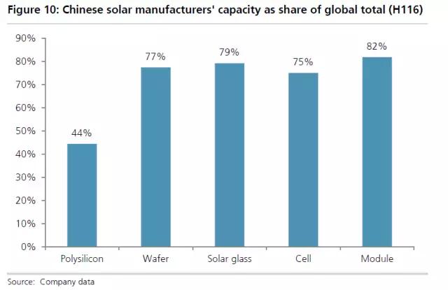 根据UBS的统计,中国公司在全球多晶硅占44%,硅片占77%,光伏玻璃占79%,电池片占75%,模组82%。