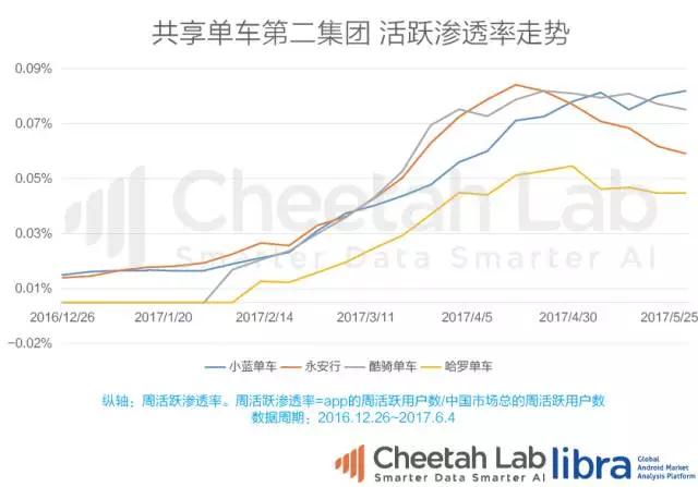小蓝单车、酷骑单车、永安行、哈罗单车组成了第二集团。第二集团的活跃渗透率明显落后于第一集团,和第一集团相比,第二集团的活跃渗透率相比于一季度末尾略有上涨,但并没有很大程度的变化。