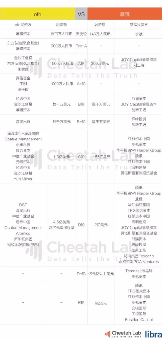 6月16日,摩拜宣布完成新一轮6亿美元融资,本轮摩拜融资由腾讯领投,摩拜截至目前融资已经超过10亿美元,融资后,摩拜估值在20亿到30亿美元之间。而据业内分析,目前ofo的估值也在20亿到30亿美元之间,据传言,ofo目前正在接洽新一轮的投资。