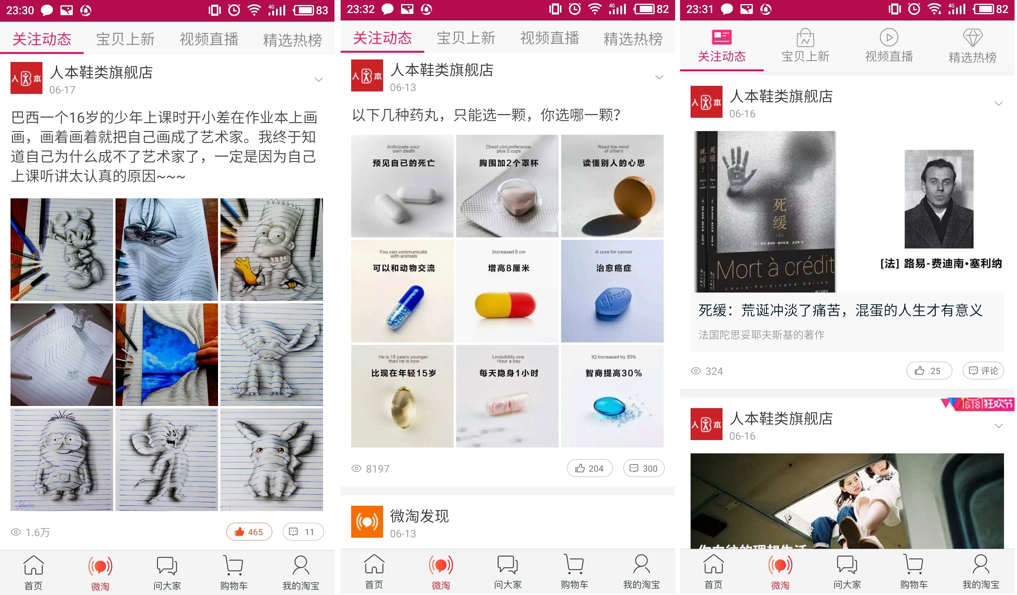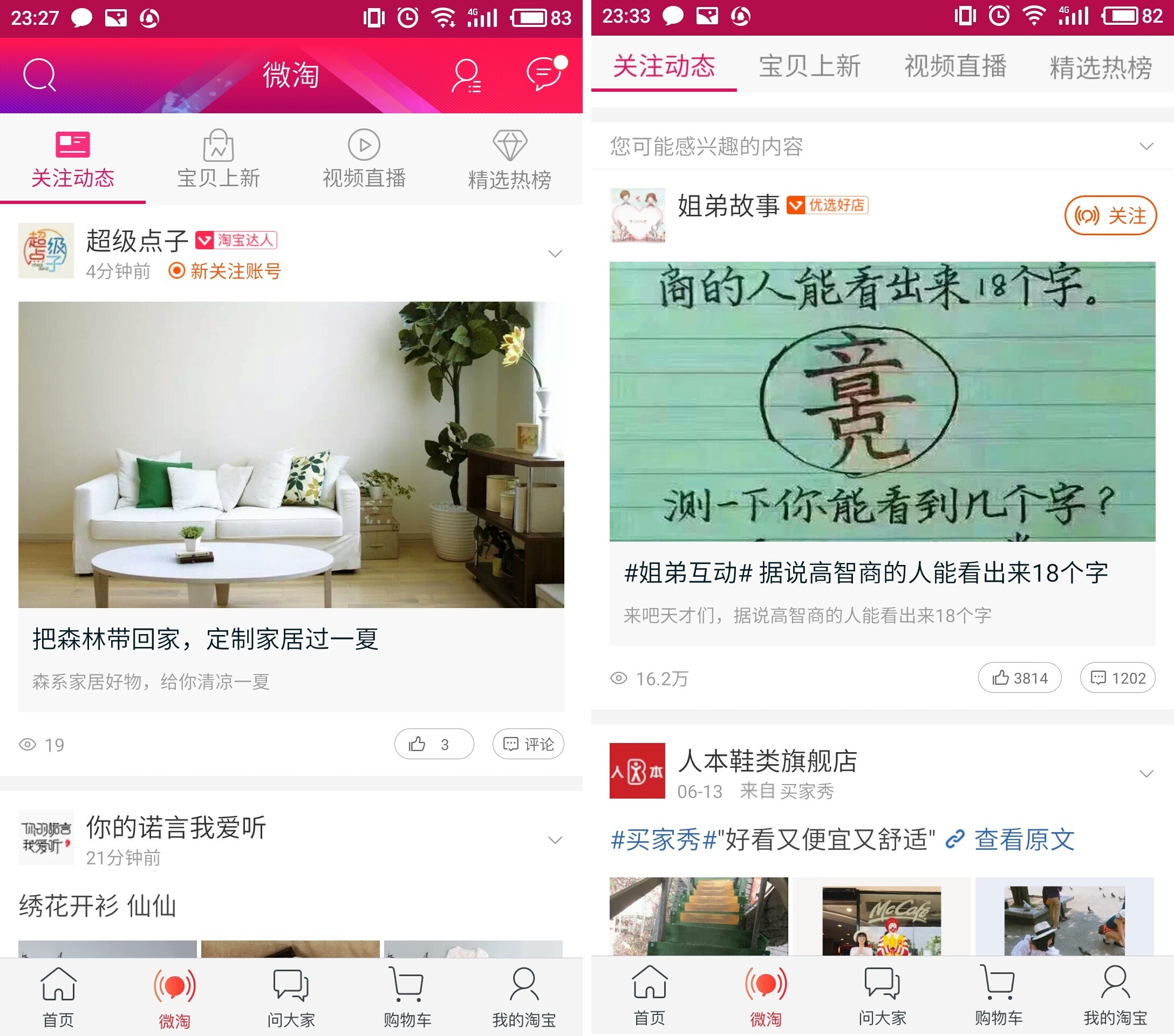 除了今日头条之外,淘宝还搭载了一个微博,第二个界面“微淘”。还记得你刚刚看的那篇种草清单吗,是由进驻了淘宝平台的内容创作者(淘宝达人)撰写,喜欢他的文章你可以关注他,喜欢哪家店你也可以关注——你所关注的账号动态,都会在“微淘”展示。