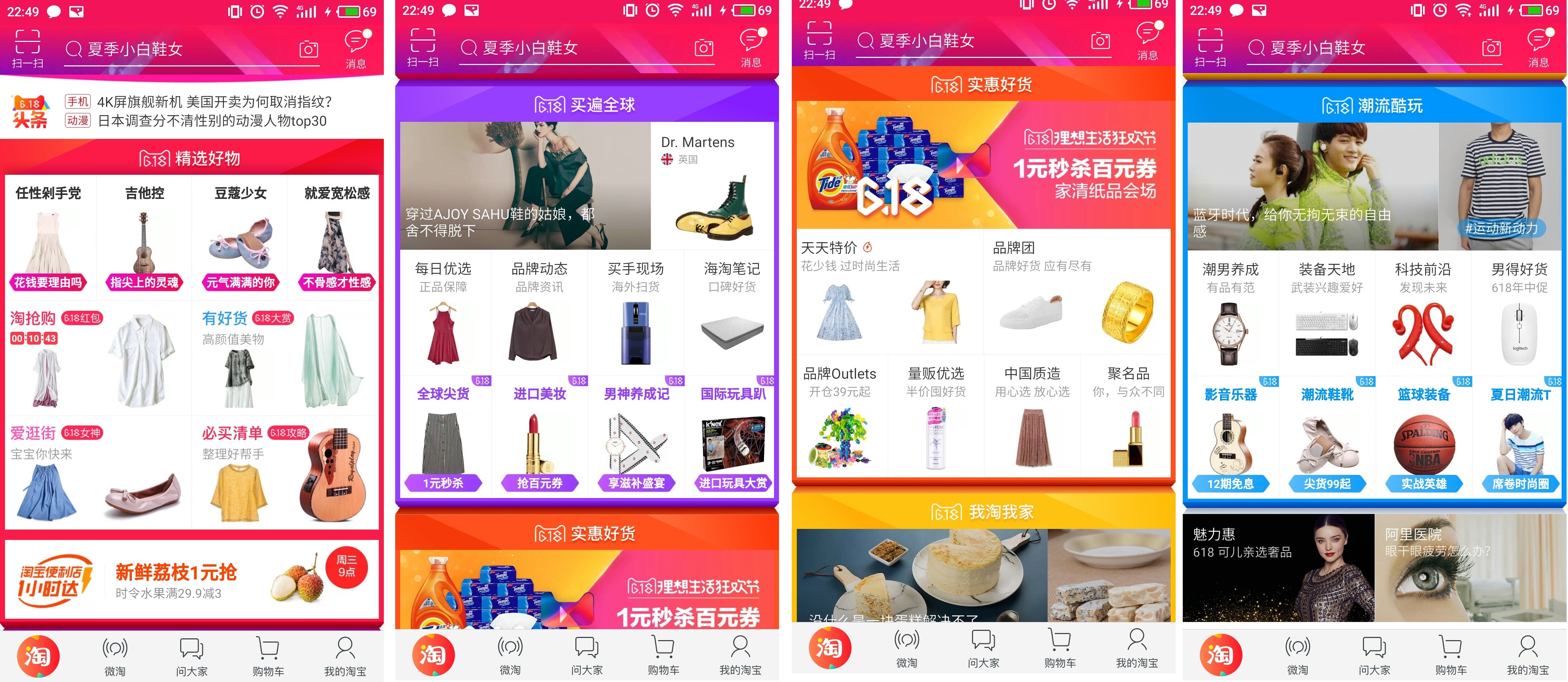 打开淘宝首页,内容展示呈现栏目化,形态是信息卡片,像一个个新闻频道:“精选好物”、“时尚大咖”、“买遍全球”、“实惠好货”、“我淘我家”、“潮流酷玩”等,分别代表着推荐、中高端潮牌、海淘频道、着重性价比、日常用品频道、年轻人频道等。