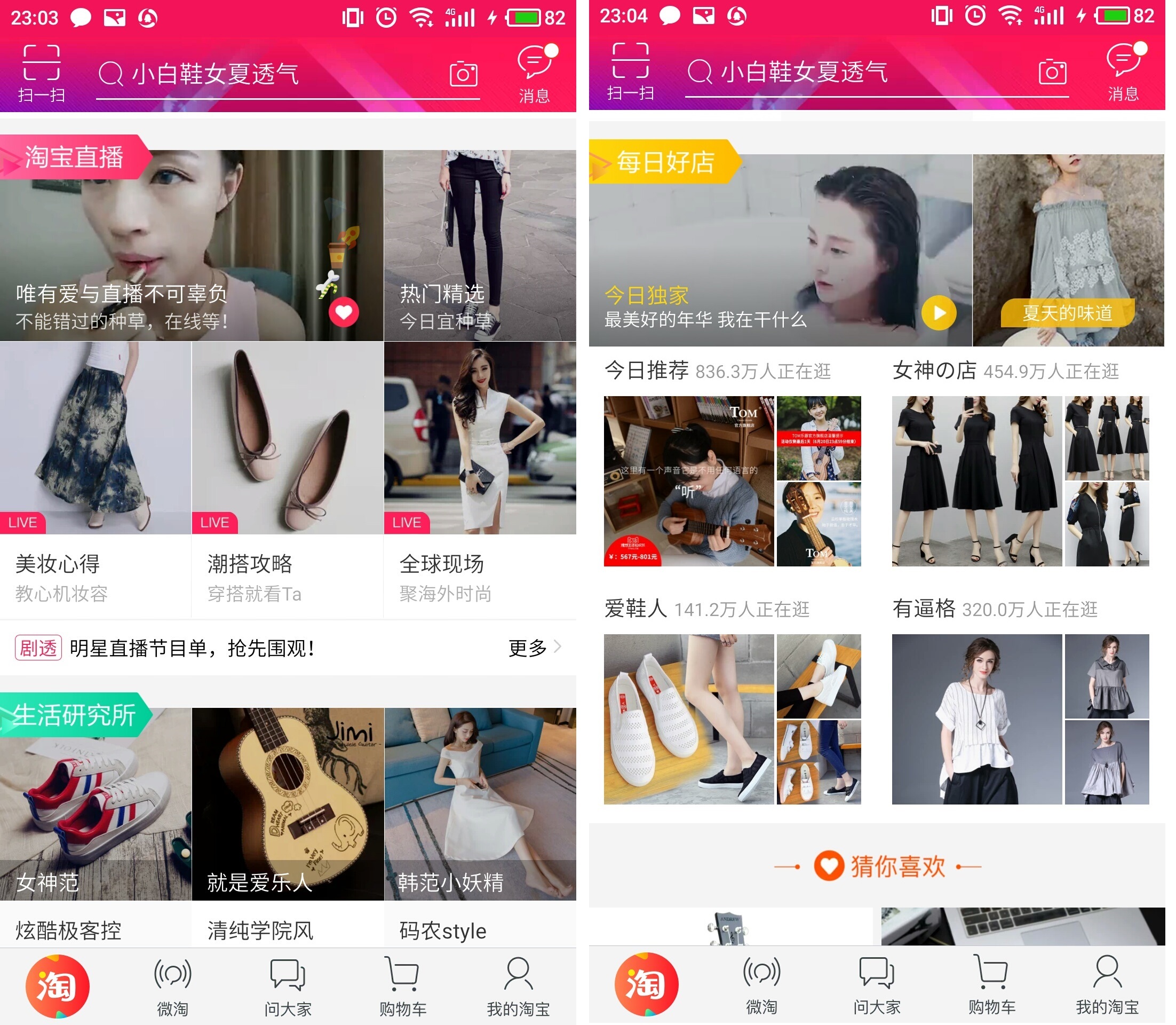 继续下拉,是淘宝直播、生活研究所、每日好店,最后才是猜你喜欢。