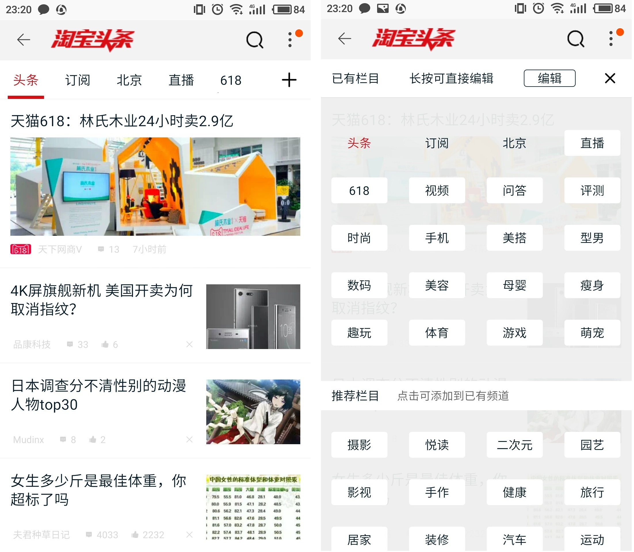 如果你觉得这还不够内容、不够媒体,可以点入首页的“淘宝头条”,里面简直就是一个“今日头条”,还能自由编辑和添加频道。