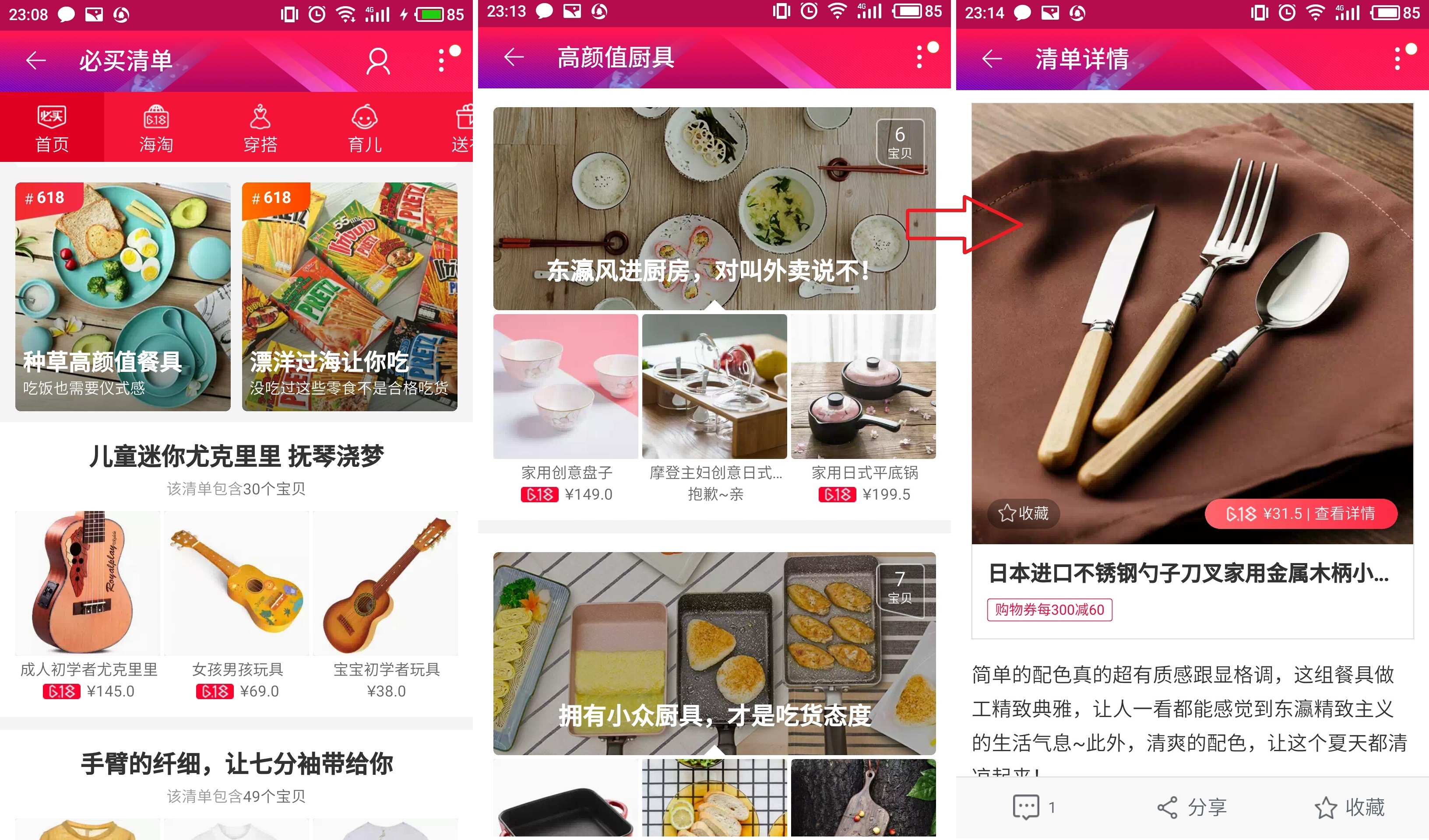 点入上面卡片中的任意一个栏目,比如“必买清单”,最上面又是两个“高颜值餐具”和“零食”的内容推荐。淘宝似乎并不急着让你下单,反而用无数充满滤镜感的精美图片在你心里种草,直到最后你进了清单详情,阅读着这篇由某自媒体撰写的文章之后,购买链接才润物细无声低出现在你面前,而你已经不知道期待这个链接多久了(终于可以下手!)。