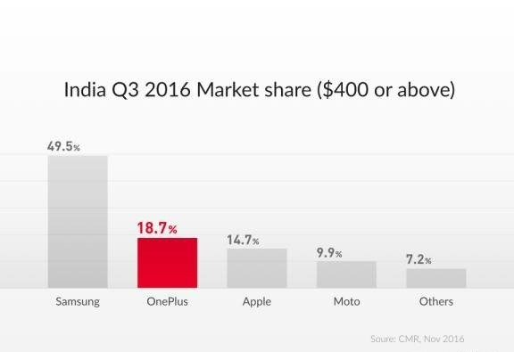 在印度高端市场也展示出绝对的品牌实力。根据去年CMR第三季度的数据显示,仅仅进入印度市场一年多,一加就占据了印度高端手机市场(400美金以上)高达18.7%的市场份额,仅排在三星之后。