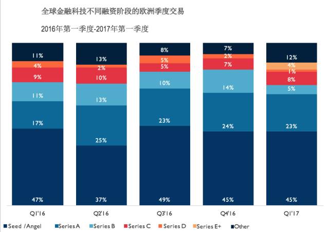 在2016年第四季度上涨到14%以后,在所有欧洲金融科技交易中B轮融资交易份额降到只有5%。