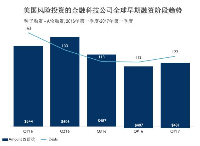 美国早期融资阶段金融科技交易,资金在2017年第一季度回升。