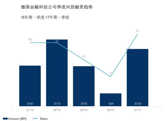 2017年第一季度,德国的风投融资数量环比上升了143%,融资额环比上升431%,主要得益对Raisin和SolarisBank等的投资。