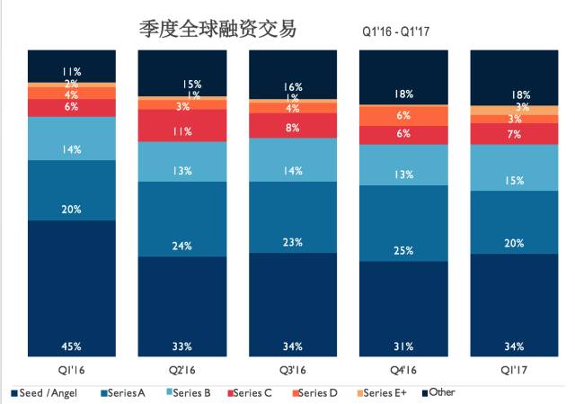 在2017年第一季度,种子阶段交易份额连续三个继续占比45%以上。