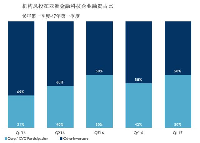 机构投资者对亚洲金融科技企业风险投资的占比从16年第四季度的42%上升到了17年第一季度的50%。