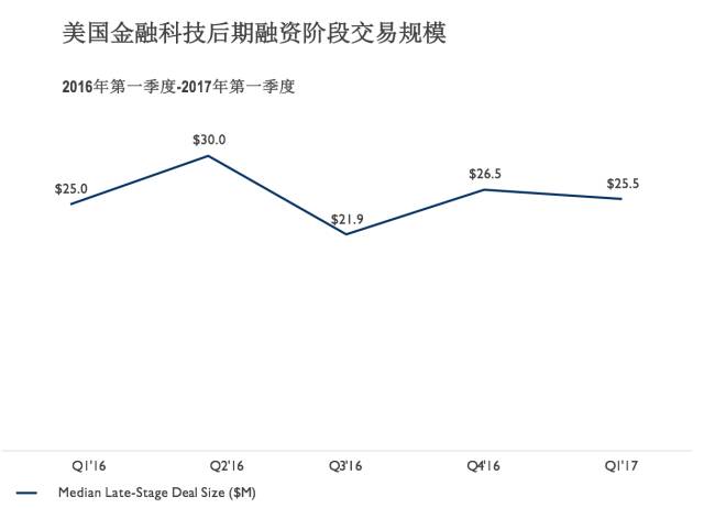 金融科技后期融资阶段交易规模中位数维持在2550万美元,与2016年第四季度2650万美元相比。
