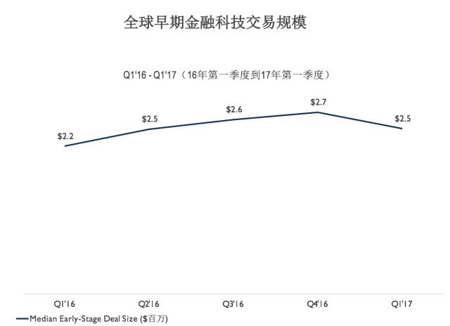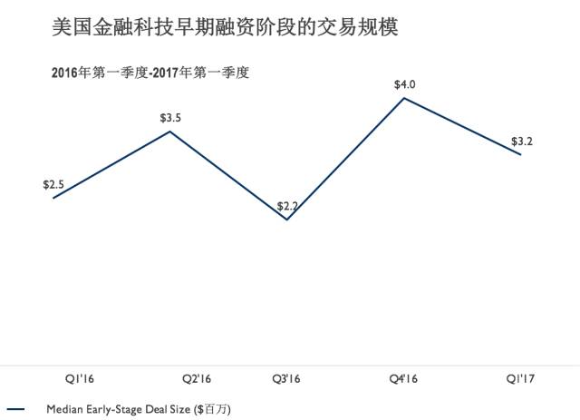 金融科技早期融资阶段交易规模中位数2017年第一季度环比下降了20%在2016年第四季度达到400万美元以后。