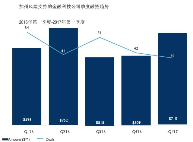 在2017年第一季度,加州风投支持的金融科技公司融资因银湖领衔对SOFI的5亿美元融资环比上升了39%。