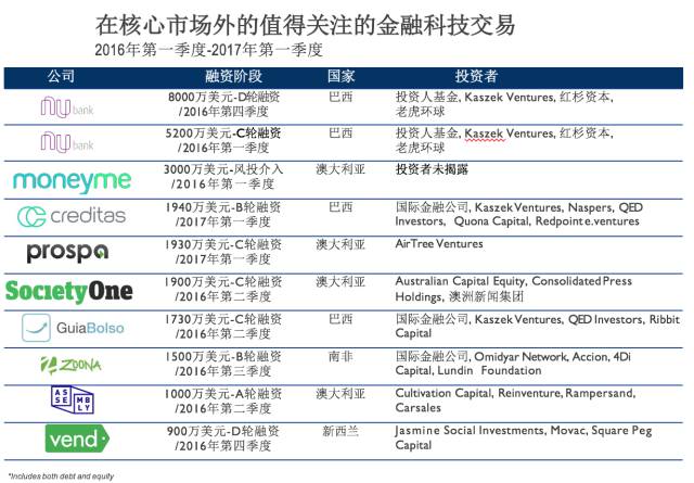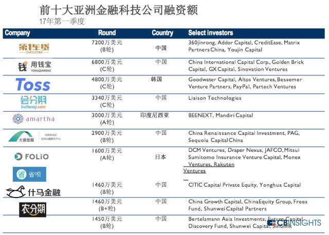 2017年第一季度,亚洲融资额前十的金融科技公司有7家来自中国。韩国支付业务领域的初创公司Viva Republica和印度尼西亚的P2P借贷平台Amartha 获得了超过3000万美元的融资。