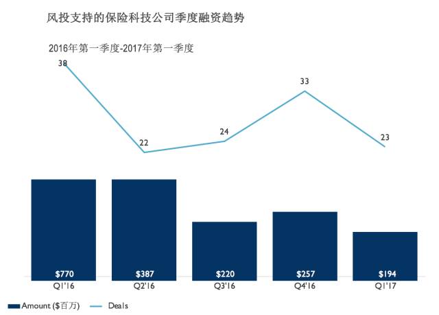 风险投资支持的保险科技公司的融资在17年第一季度下降了25%,而交易活动下降了30%。