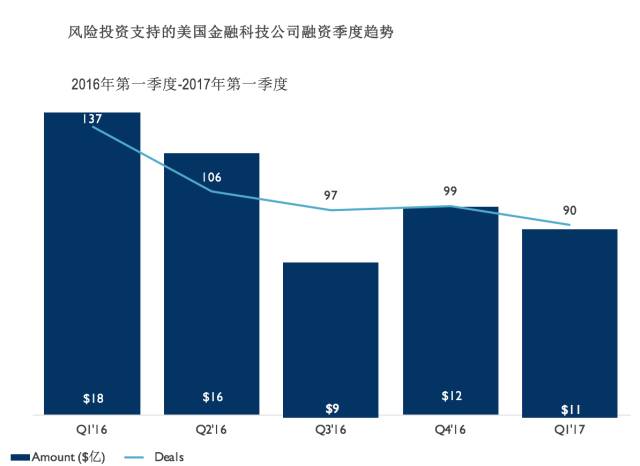 在2017年第一季度中,美国风险支持的金融科技新兴公司的融资在90个交易中上升了11亿美元
