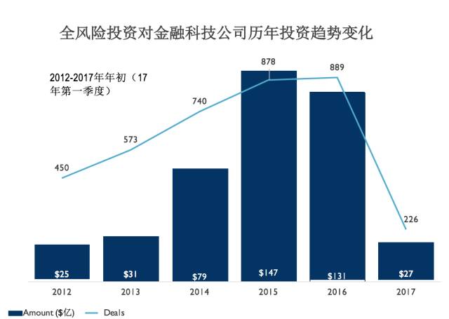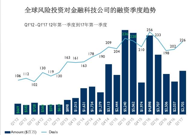 2017年第一季度全球风投支持的金融科技初创企业通过226笔交易融资27亿美元。