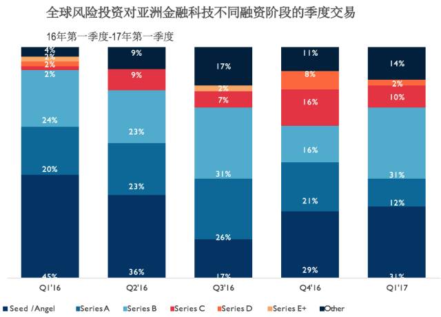 金融科技A轮融资交易份额降到5季度以来的最低,而B轮从上季度的16%上升到17年一季度的31%。