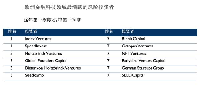 INDEX VENTURES和SPEEDINVEST是最活跃的欧洲金融科技投资者。