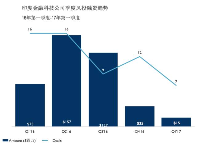 16年第四季度的金融科技融资达到了7个季度最低点。在17年第一季度A轮融资才稍微恢复—达到4.31亿美元。
