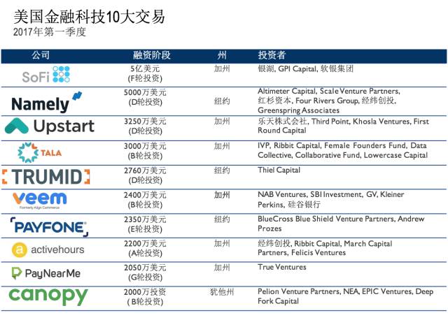 在2017年第一季度,美国风投支持的金融科技10大交易总额达7.5亿美元,其中三分之二来自由银湖领衔的SOFI5亿美元的融资。