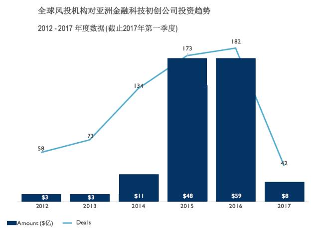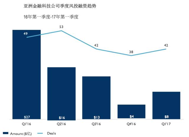 2017年第一季度,亚洲的金融科技初创公司获得了8.26亿美元超过42笔投资交易。